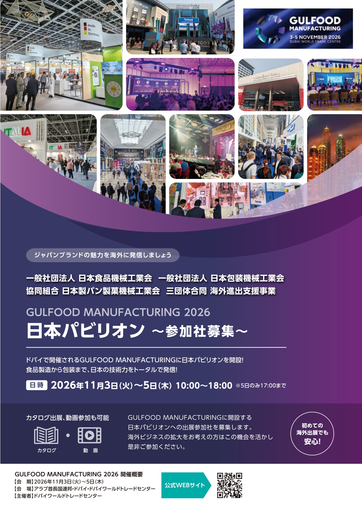 当会は、2026年11月にUAE・ドバイで開催される世界有数の食品・飲料製造総合展『Gulfood Manufacturing 2026』において、関連団体と共同で「日本パビリオン」を新設いたします。 Gulfood Manufacturingは、MEASA(Middle East, Africa, South Asia)を中心に、世界各国から食品・飲料製造分野の最新製品・技術やトレンドなどが一堂に会する国際見本市であり、成長著しい同地域市場へのビジネス展開を図る重要なプラットフォームとなっています。 本新規事業は、当会ならびに日本食品機械工業会、日本製パン製菓機械工業会の三団体が共同で実施するもので、食品・飲料の製造・加工から包装に至る一連のラインナップを「日本パビリオン」として体系的に展示・公開することにより、MEASAおよび国際的な食品・飲料関連ステークホルダーに向けて、日本の高品質かつ信頼性の高い技術力を“オールジャパン”として発信してまいります。Gulfood Manufacturingおよび海外展示会への出展が初めての皆様におかれましても、運営事務局が出展準備から当日の運営まで適宜サポートいたしますので、安心してご参加いただけます。 |